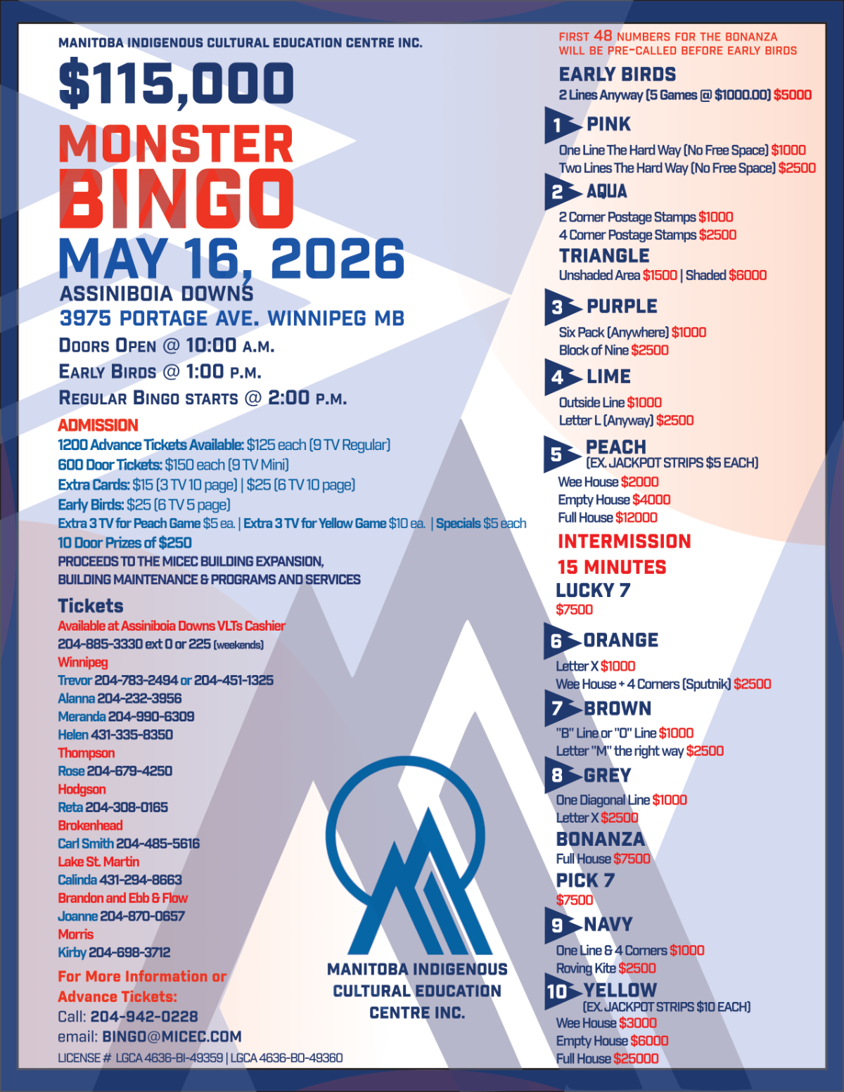 MICEC is proud to announce our next Monster Bingo on May 16, 2026 at Assiniboia Downs!